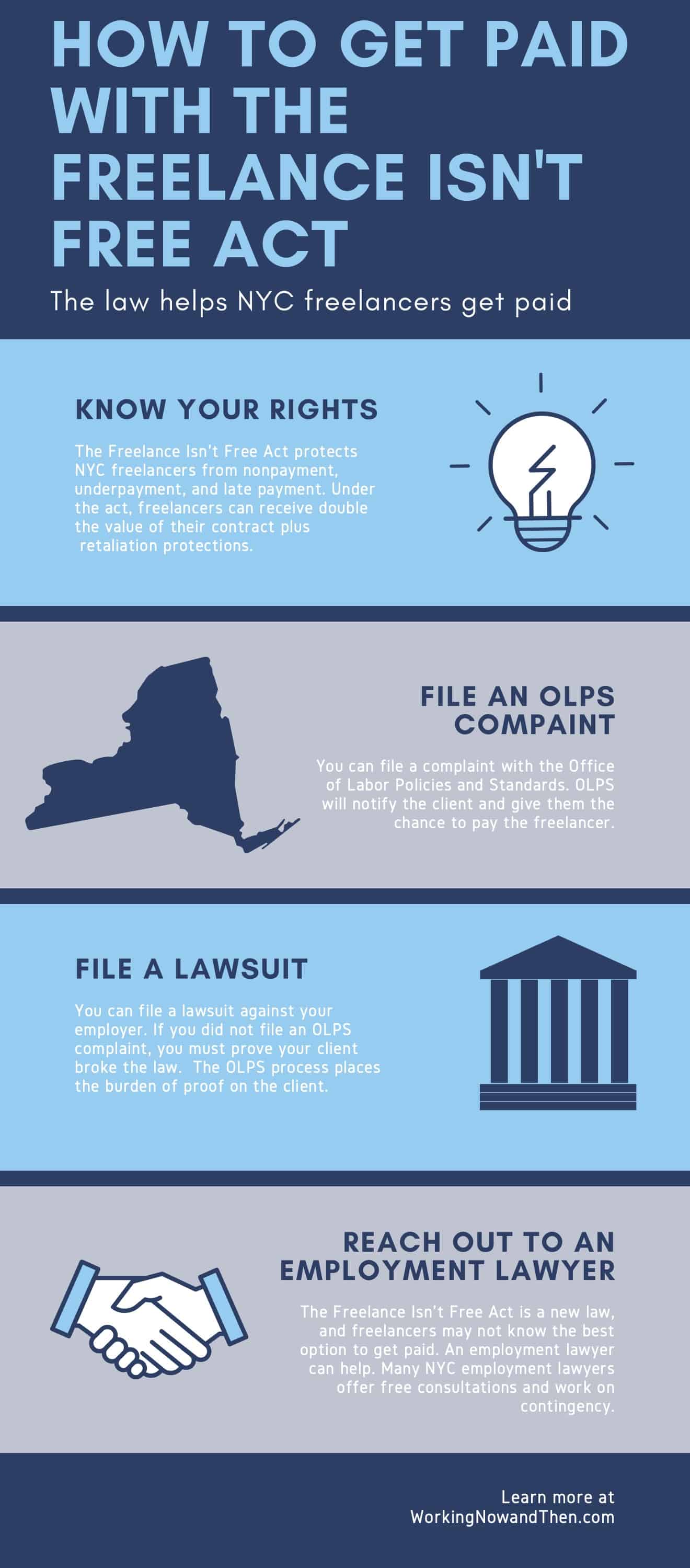 Freelancers who have not received payment can contact a lawyer to protect their rights. The Freelance Isn’t Free Act covers attorney fees for freelancers who successfully receive payment on their claims.