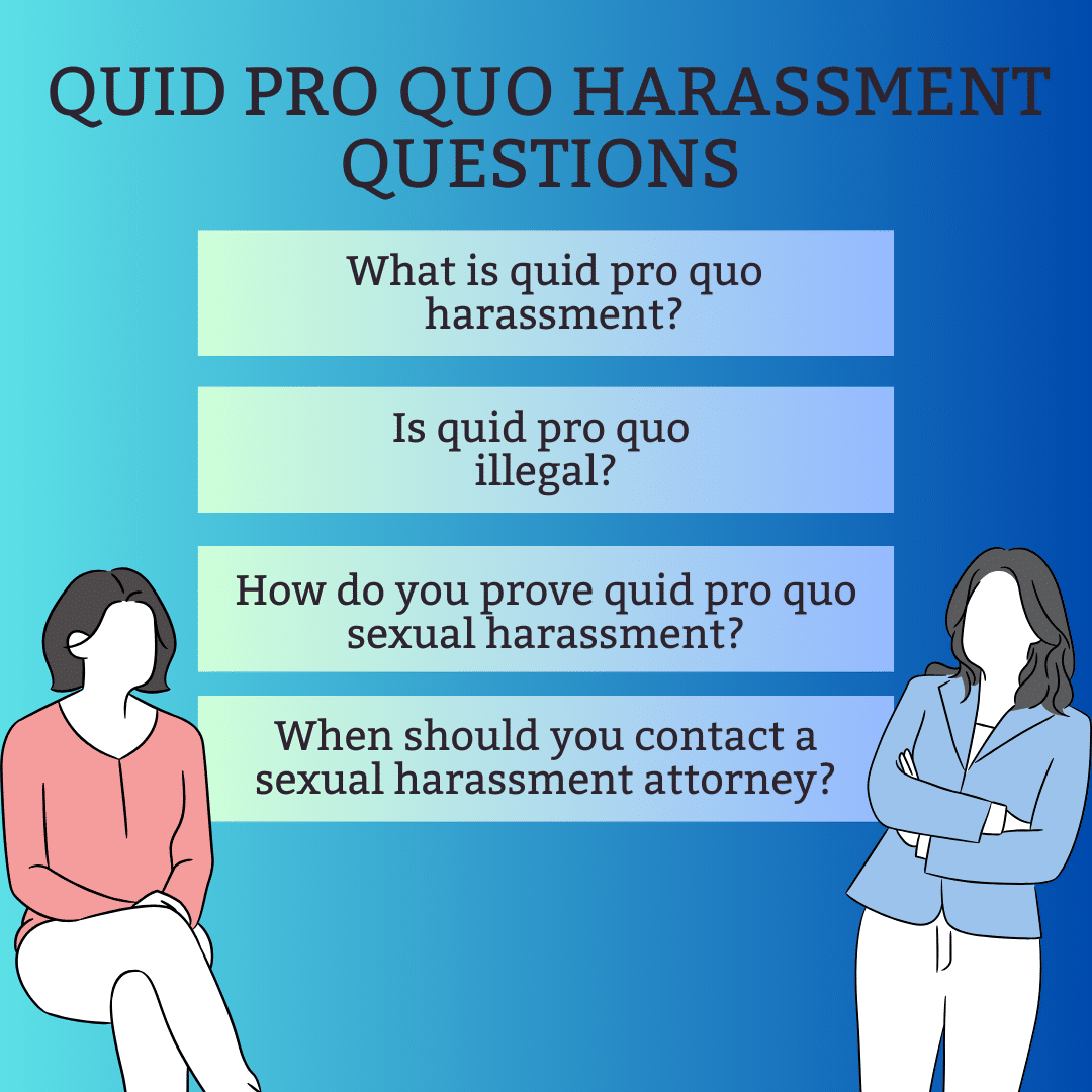 Requiring sexual favors at work is illegal. If you’ve faced quid pro quo harassment, a quid pro quo attorney can help you collect evidence, build a strong case, and file a quid pro quo lawsuit.